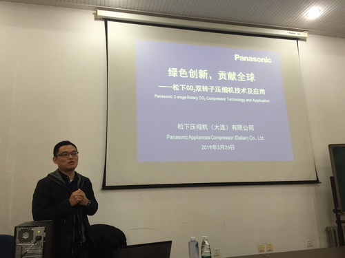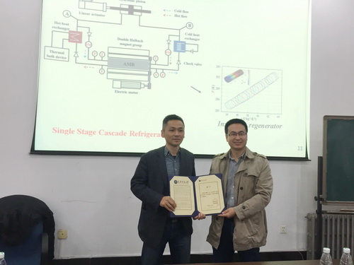 中科院理化所研究员戴巍与大连松下压缩机有限公司的胡继伟分别作主题为“磁和热声制冷相关技术的最新进展”和“松下CO2双转子压缩机技术及应用”的专题报告。戴巍针对磁制冷技术的最新进展进行了讲解,包括磁制冷及热声制冷的原理及其应用的场所等。胡继伟对松下CO2双转子压缩机进行了专业讲解,并结合实际得出的数据进行说明和对比,还介绍了目前市场上有关自然工质CO2作为制冷剂的前景。刘圣春为两位专家颁发校外兼职教师聘书,并欢迎两位专家常来我校为同学们传道授业解惑。